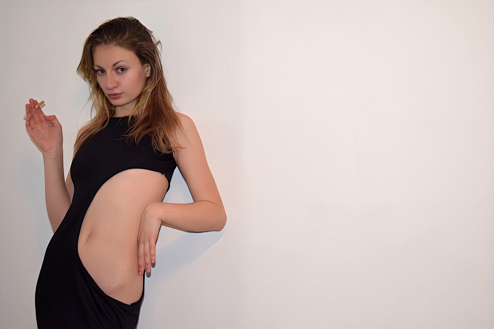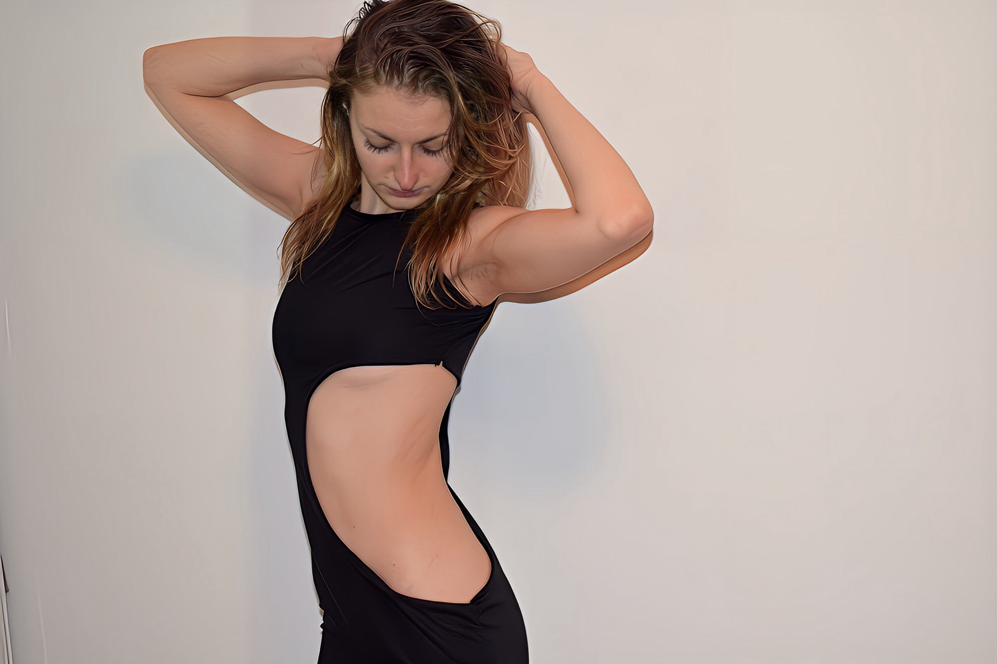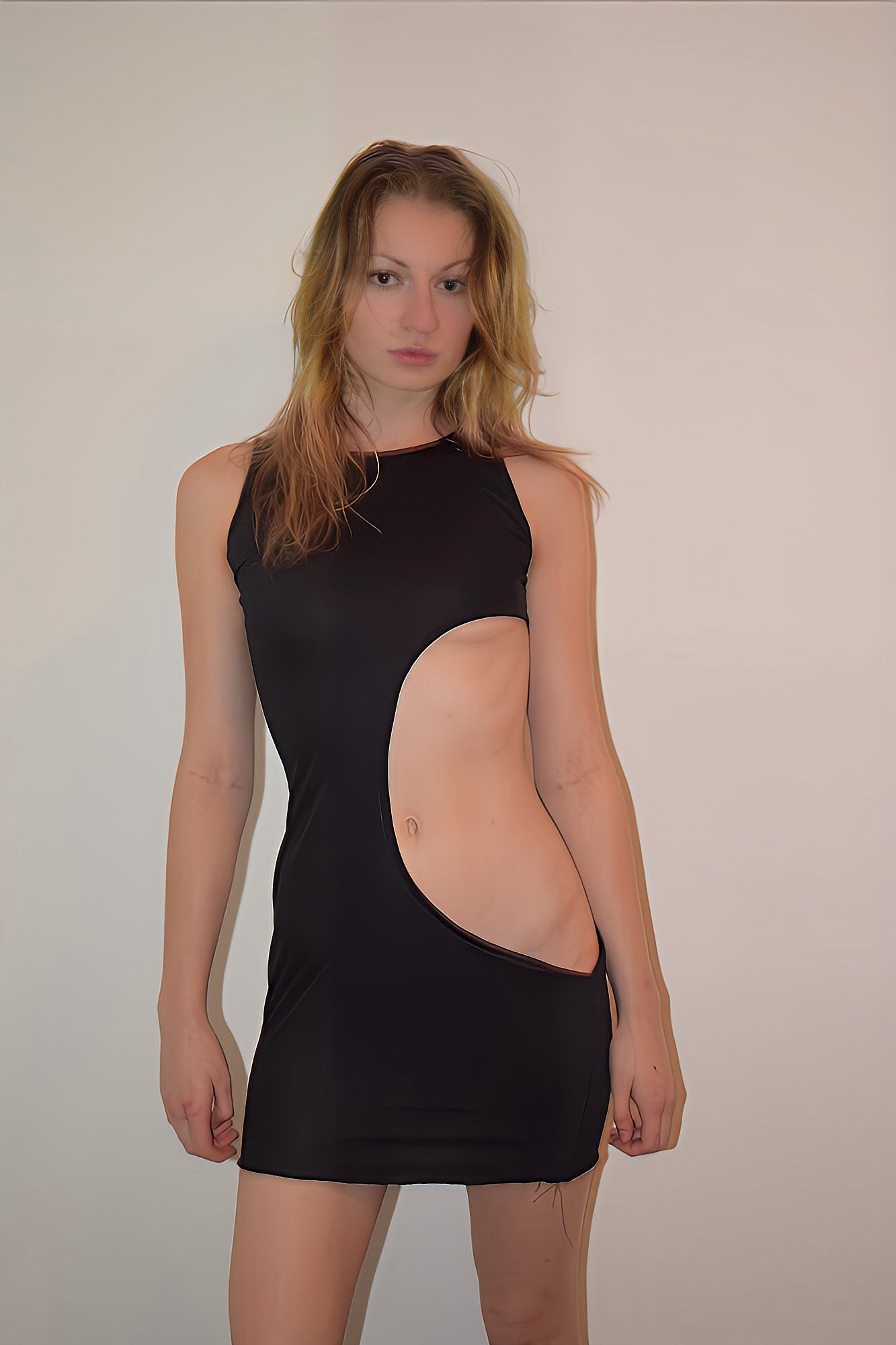 Discover the allure of our Black Sleeveless Cutout Dress – a daring blend of style and sophistication. Handcrafted with care, this dress boasts a mid-torso cutout, revealing ribs and adding a touch of rebellious charm. Made from jersey knit fabric, it ensures comfort and a perfect fit.